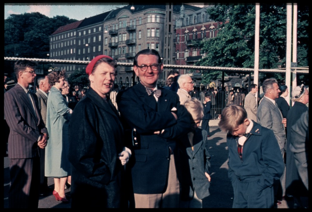 Bilden föreställer en kvinna och en man fotograferade i trekvartsfigur stående framför en folksamling. I bakgrunden hus.