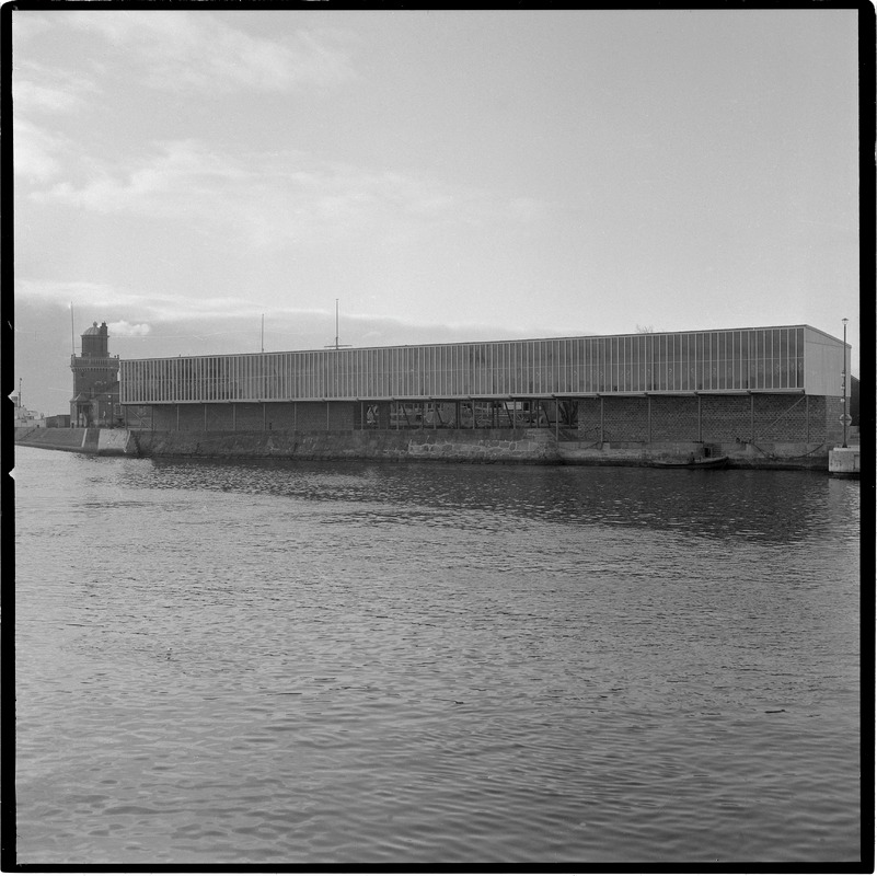 Bilden föreställer en öppen yta i en hamn. I bakgrunden en lång byggnad med en fyr till vänster.