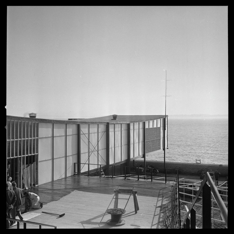 Bilden föreställer tak med staket, där bakom paviljong med antenn och sedan hav.