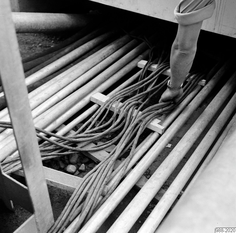 Bilden föreställer ett utrymme med ledningar av något slag, ev vatten under en arm sträcks ner.