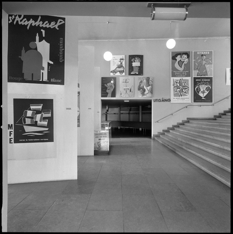 Bilden föreställer en öppen hall i lokal med trappa till höger. Därutöver väggar med affischer samt öppning med texten utgång.