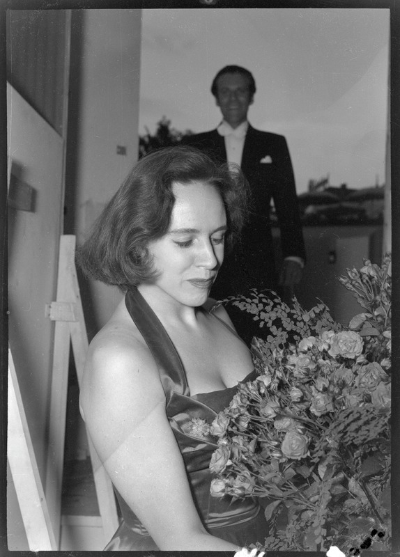 Bilden föreställer en kvinna fotgraferad i halvformat med stor blombukett i famnen. I bakgrunden en man.