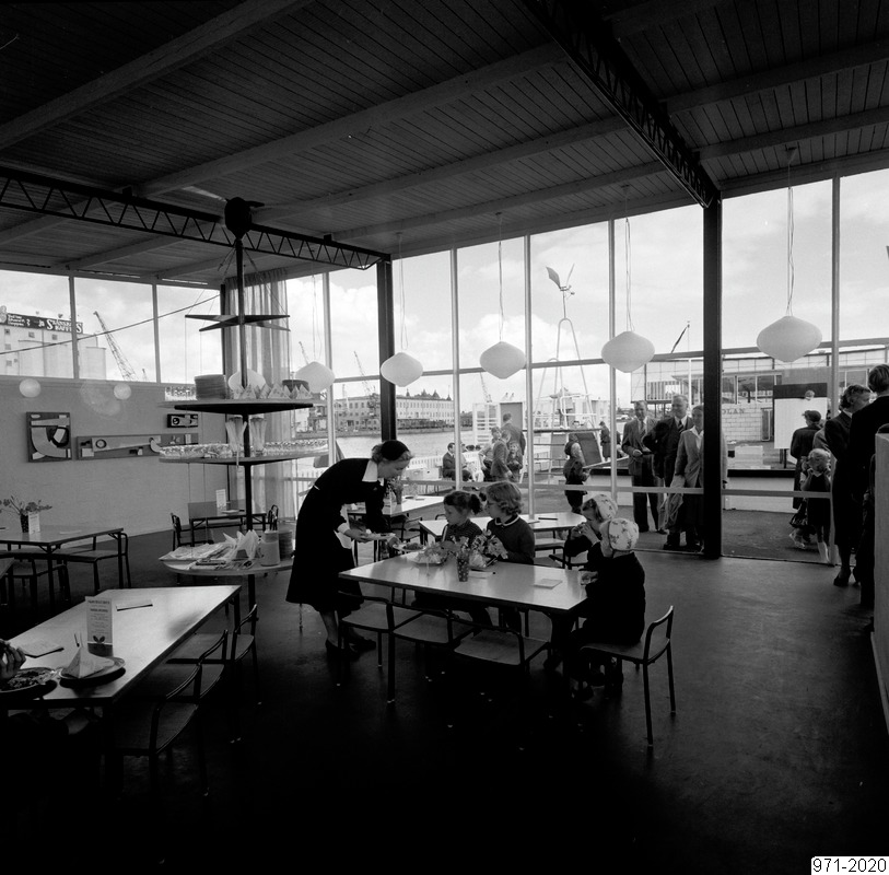 Bilden föreställer en öppen lokal möblerad som en matsal. I lokalen vistas lite människor. I bakgrunden glasfasad
