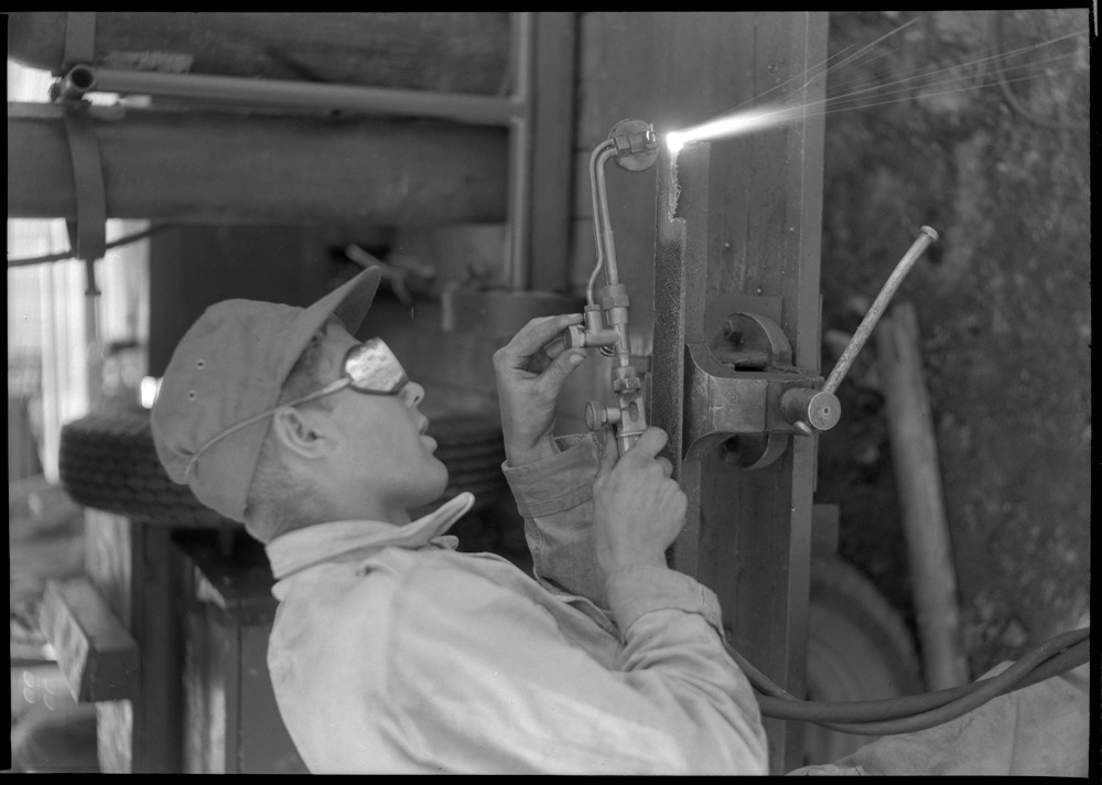 Bilden föreställer en man som håller i en svets med låga inomhus i ett utrymme.