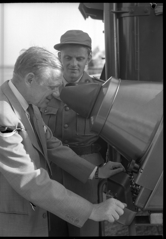 Bilden föreställer två män i bröstformat som tittar in i ett tekniskt instrument.