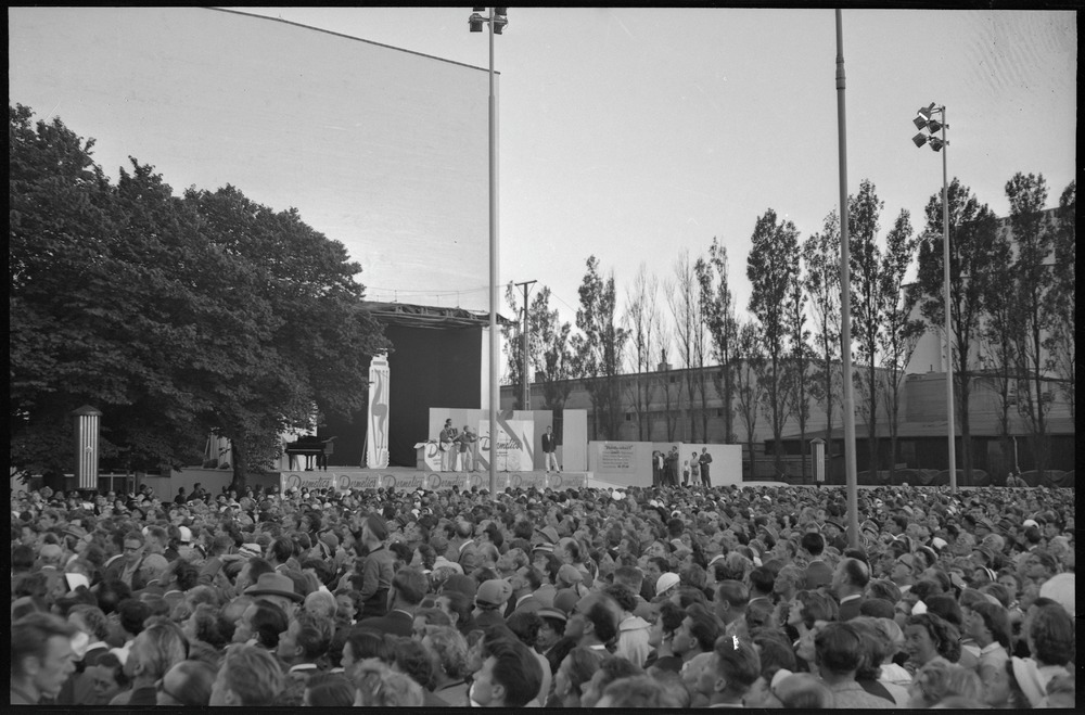 Bilden föreställer ett stort folkhav. I bakgrunden en scen där det står musiker. Vid sidorna träd.