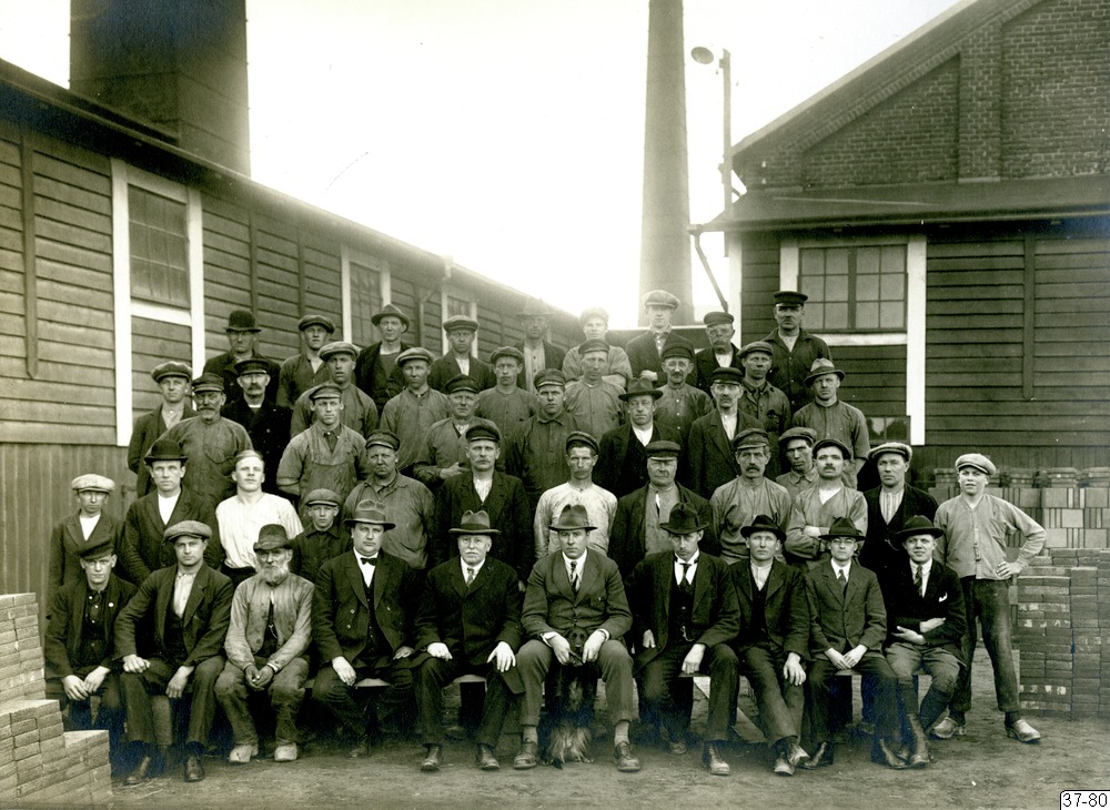 Svartvitt grupporträtt av ledning och arbetare vid Helsingborgs Ångtegelbruk. Männen är uppställda i fem rader, främre raden sittande. En del är iklädda kostym, andra arbetsklädsel. Bakom dem syns tegelbrukets byggnader, samt staplar med färdigt tegel.