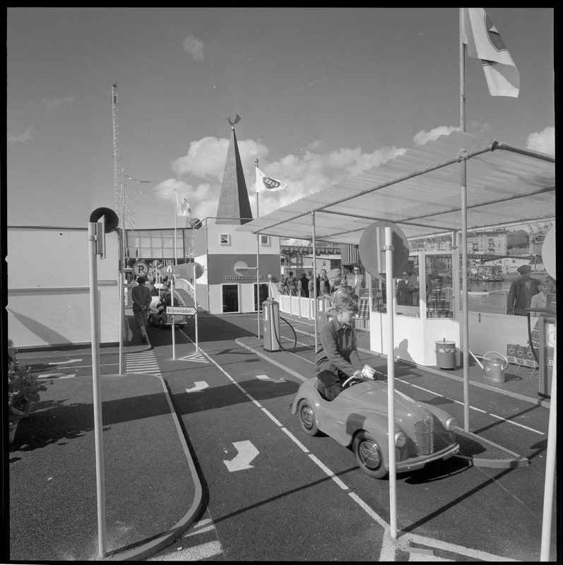 Bilden föreställer en del av en trafikskola med vägar, vägmärken samt en liten bil med ett barn i. Där är också en modell av en bensinmack.