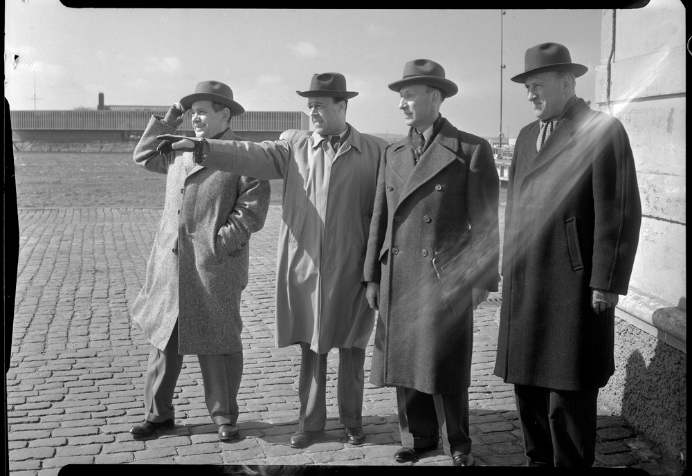 Bilden föreställer fyra herrar i helfigur utomhus iklädda rock och hatt.