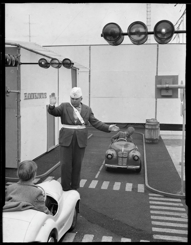 Bilden föreställer två leksaksbilar i vilka sitter två barn, vid sidan en man i uniform. Troligen på en gata i barnens trafikskola. Över gatan belysning.