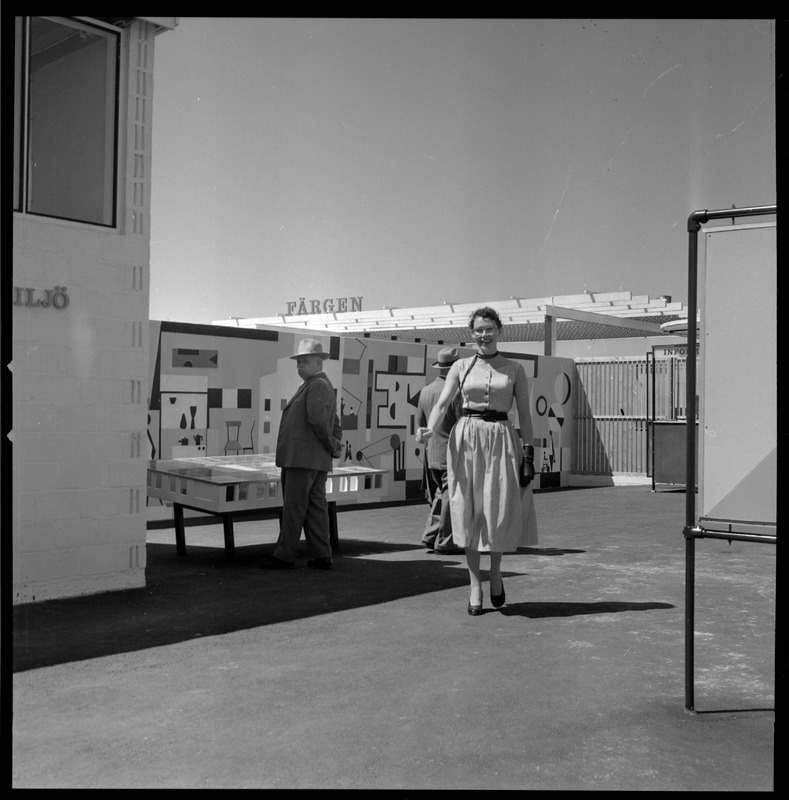 Bilden föreställer några byggnader med öppen yta emellan där någgra besökare flanerar.