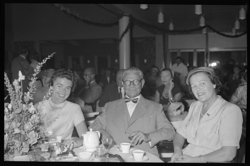 Bilden föreställer två kvinnor och en man sittande vid ett bord dukat för kaffedrickande. På bordet står också ett blomarrangemang. I bakgrunden andra restauranggäster.