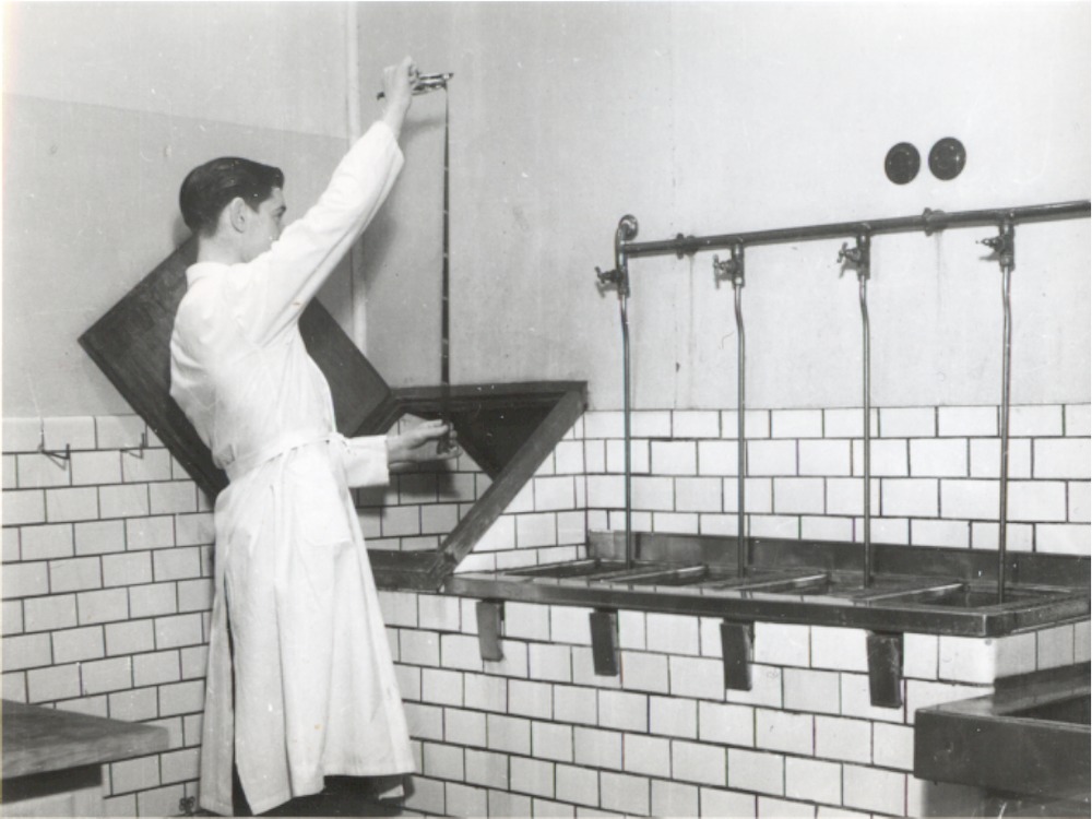 Fotografi som avbildar en okänd man arbetandes. Bilden är troligen tagen i Hefomas labb på Järnvägsgatan 3 eller på en av deras filialer, kanske på Södergatan.
