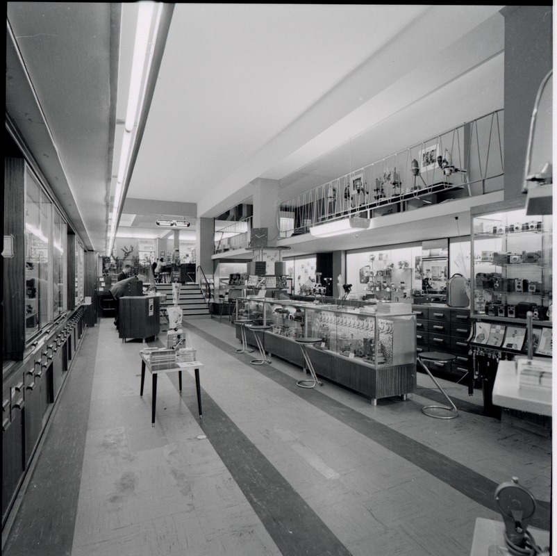 Fotografi som avbildar Hefomas affär på Järnvägsgatan 3 strax efter ombyggnaden 1957-1958. Här ser vi fotografiavdelningen, längre bort ser vi skyltar som leder till tadio-tv och grammofon avdelningen.