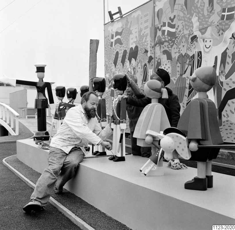 Bilden föreställer ett podium med flera trädockor, längst bak man i uniform. Vid dockorna sitter en man. I bakgrunden en fasad med ett konstverk målat på.