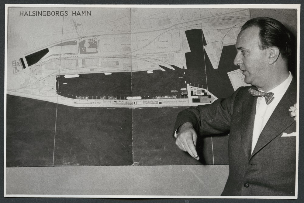Bilden föreställer Acking. Man fotograferad i halvformat framför ritning över parapeten och Helsingborgs hamn.