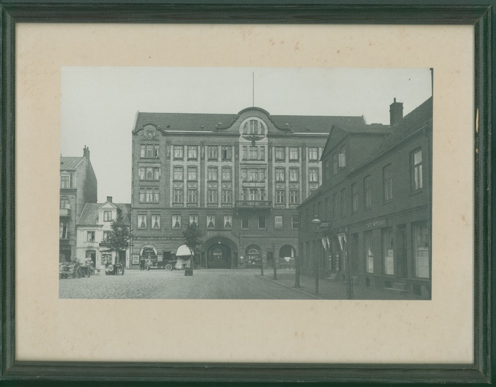 Svartvitt fotografi inom glas och ram, föreställande Folkets hus på Gustav Adolfs torg i Helsingborg.