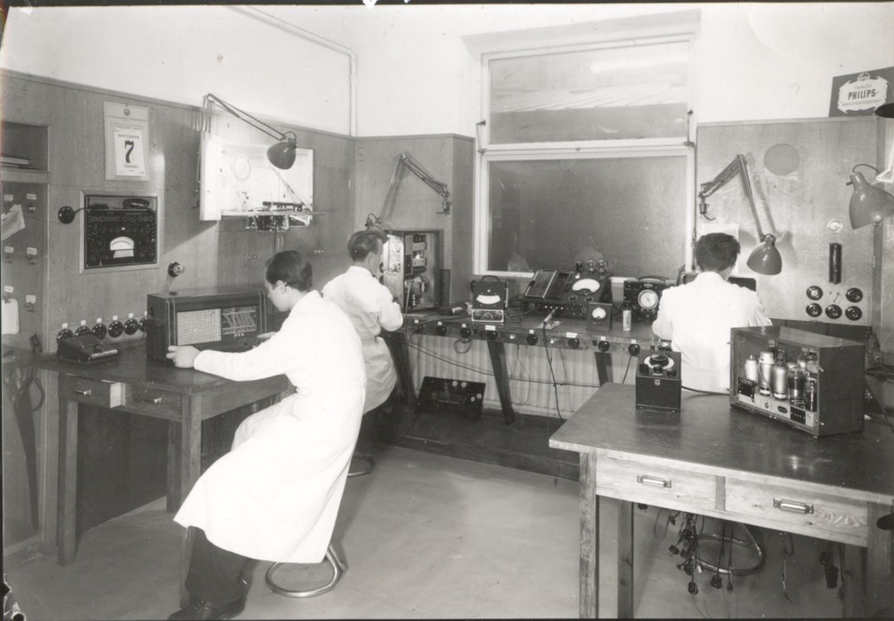 Fotografi som avbildar Hefomas radioservis med tre okända män i hårt arbete. Bilden är troligen tagen i Hefomas labb på Järnvägsgatan 3 eller på en av deras filialer, kanske på Södergatan.