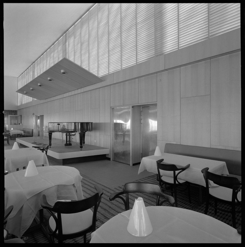 Bilden föreställer en stor lokal med bord med dukar och lampor på och stolar intill. I bakgrunden låg scen med flygel på