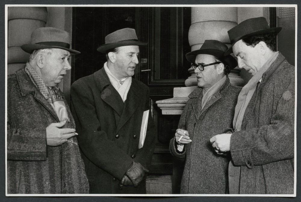 Bilden föreställer från vänster till höger Gotthard Johansson, Carl-Axel Acking, okänd, Bengt Gate. Männen är fotograferade i halvformat i ytterkläder. Två av männen röker.
