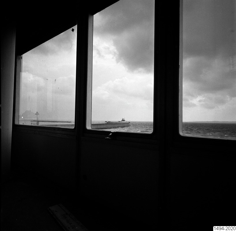 Bilden föreställer en fasad med fönster på mitten. I bakgrunden hav och kaj.