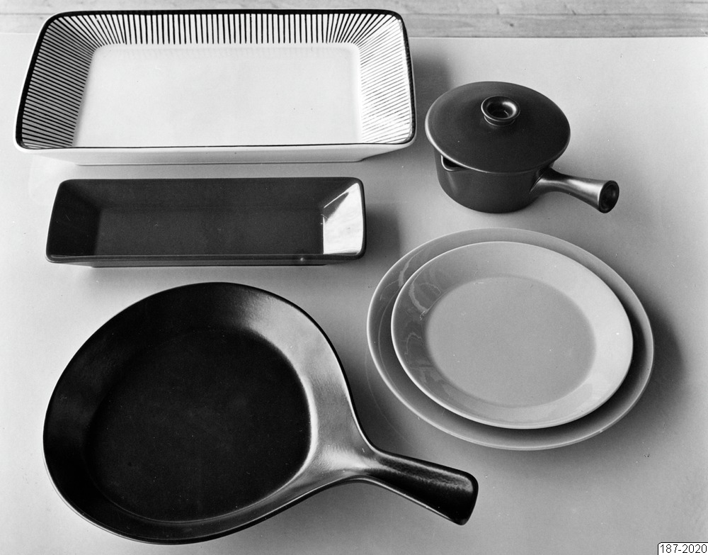 Bilden föreställer köksredskap. Till vänster tre olika uppläggningsfat, till höger en karott med lock och två stycken tallrikar.