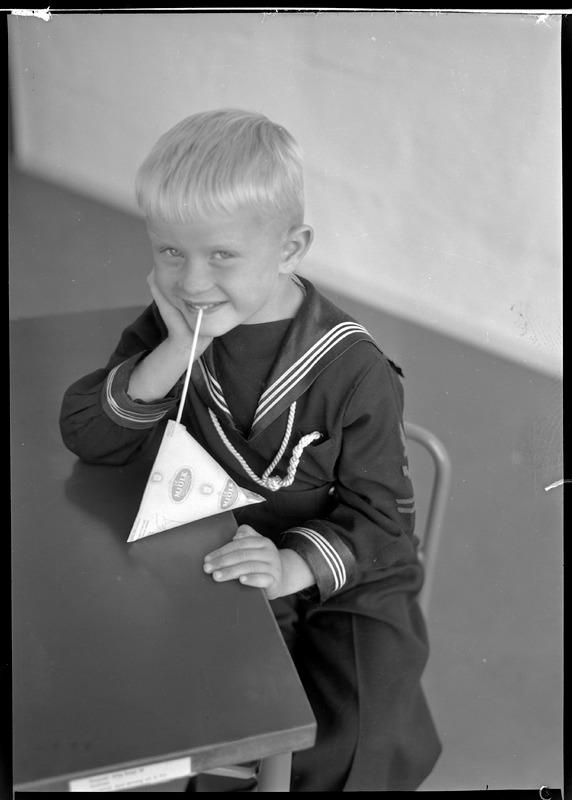 Bilden föreställer en liten pojke som sitter vid ett bord och dricker mjölk med ett sugrör i en tetra förpackning.