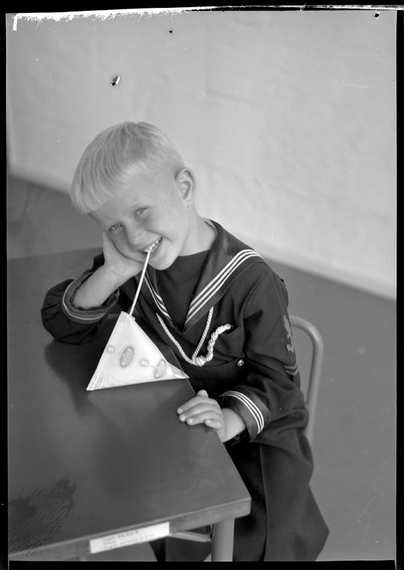 Bilden föreställer en liten pojke som sitter vid ett bord och dricker mjölk med ett sugrör i en tetra förpackning.