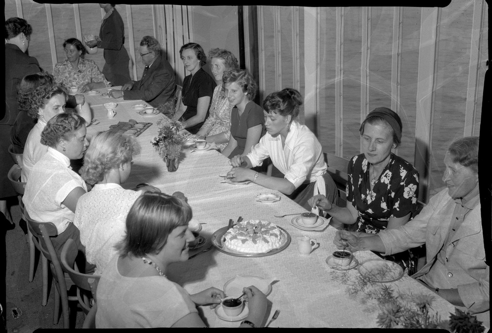 Bilden föreställer ett långbord med sittande personer mest kvinnor. PÅ bordet kaffekoppar och en tårta samt blomvasar.