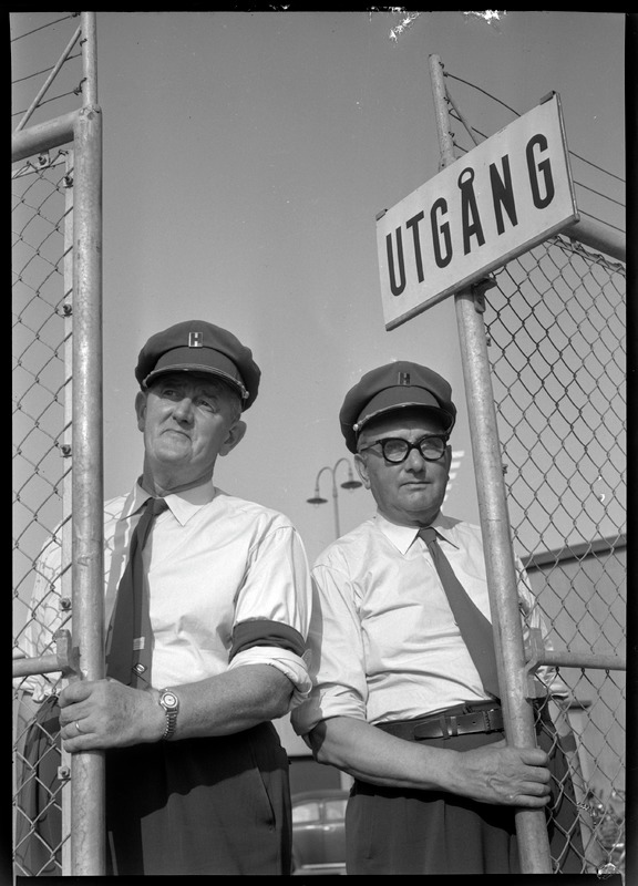 Bilden föreställer två stående män i trekvartsformat vid en grind, med texten utgång. Männen ser ut att ha en uniform med skjorta, slips och skärmmössa.