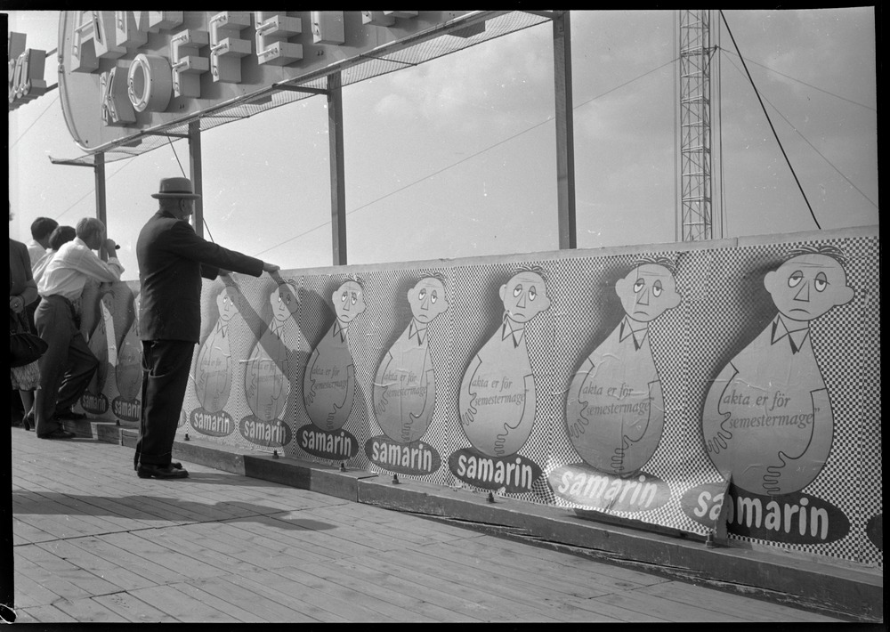 Bilden föreställer en låg vägg med en affisch med en återkommande människoliknande figur med uppsvälld mage med texten akta er för semestermage. Undertill skylten samarin. I bakgrunden står några människor.