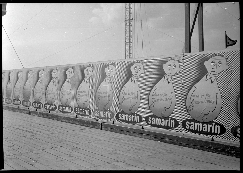 Bilden föreställer en låg vägg med en affisch med en återkommande människoliknande figur med uppsvälld mage med texten akta er för semestermage. Undertill skylten samarin.