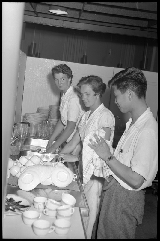 Bilden föreställer två kvinnor och en man som håller på att diska och torka kaffekoppar med fat samt asitter och glas.