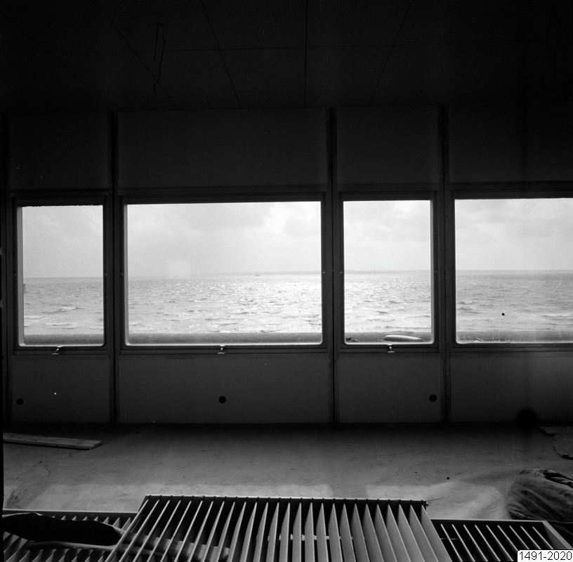 Bilden föreställer en fasad med fönster på mitten. I bakgrunden hav. I förgrunden golv.