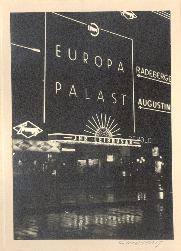Fotografi taget av och undertecknat av Sture Claesson som avbildar biografen Europa Palast i Berlin, Tyskland. Sture Claesson var ofta på mässor så bilden är troligen tagen i anknytning till en sådan resa. Bilden är troligen tagen någon gång på 1930-talet.