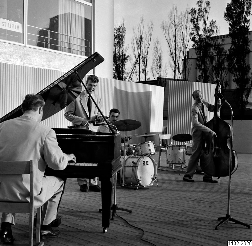Bilden föreställer en orkester på Gröningens scen. I förgrunden en man vid en flygel, där bakom en man och sedan en man vid trummor. Längst bak en man med basfiol. I bakgrunden en fasad.