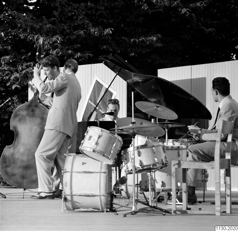 Bilden föreställer en jazz orkester. Till vänster en trumslagare med trummor, där bakom en man med basfiol och en annan man med blåsinstrument..