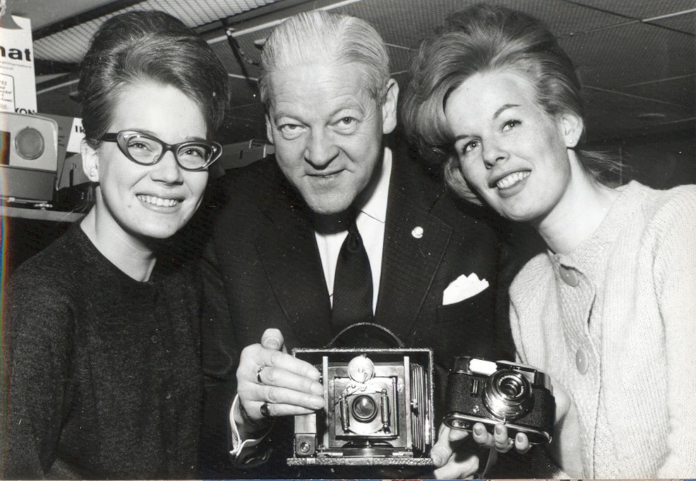 Fotografi som avbildar Sture Claesson och två okända kvinnor, tillsammans presenterar de två kameror varav en är äldre och en nyare. Var och när bilden är tagen är okänt, men troligen på Järnvägsgatan 3 eller Stortorget 16.