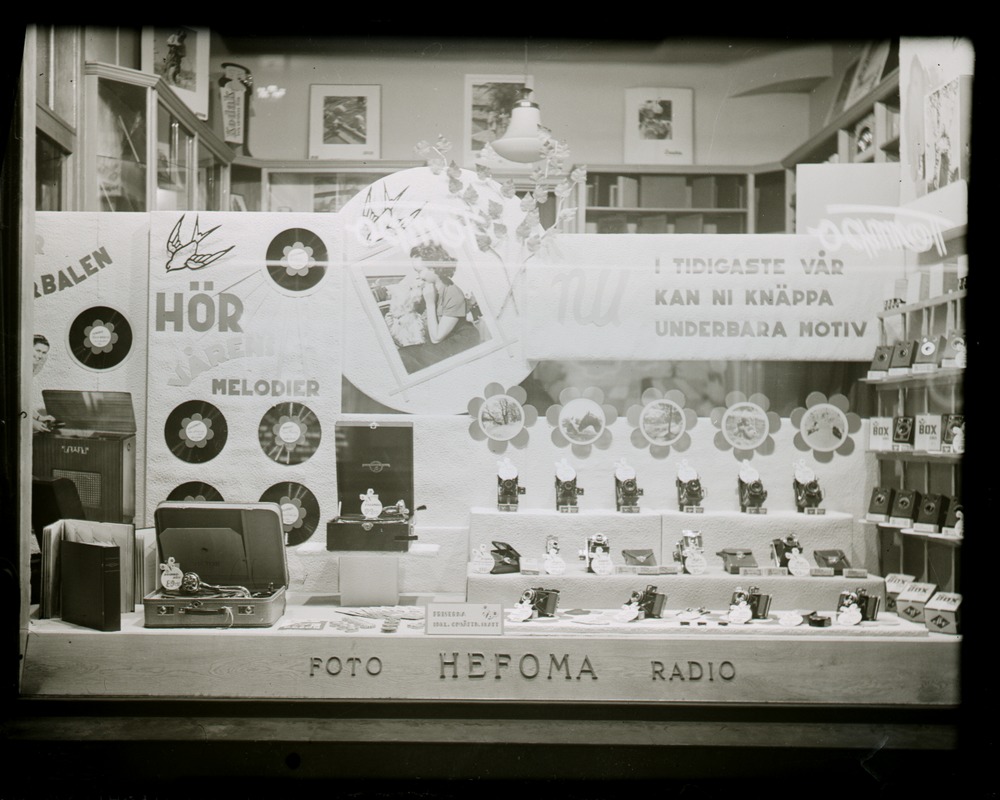 Fotografi som avbildar ett skyltfönster i Hefomas affär på Järnvägsgatan 3, i fönstret ser vi många typer av kameror och grammofonspelare och skivor. Bilden är troligen tagen på 1930 eller 1940-talet.