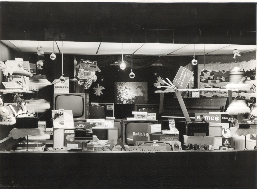 Fotografi som avbildar ett skyltfönster i Hefomas affär på Järnvägsgatan 3, i fönstret ser vi reklam för Philips och Sony televisionsapparater tillsammans med grammofonspelare och radioapparater. Bilden är troligen tagen runt 1960-talet.