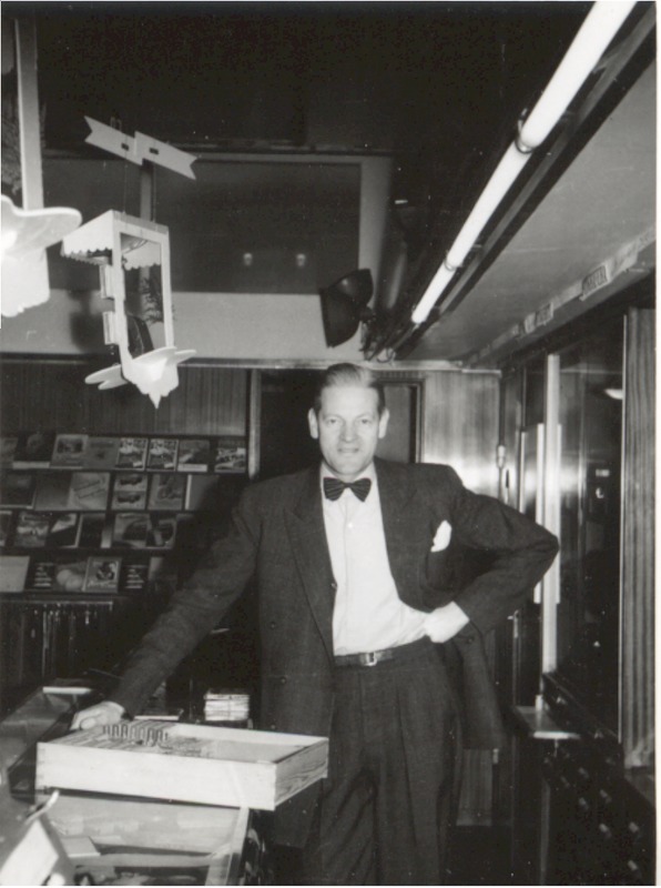 Fotografi som avbildar Sture Claesson som arbetade på Hefoma som butikschef på Järnvägsgatan 3. Här står han bakom disken i fotoavdelningen med de täckta skyltfönsterna ut mot järnvägsgatan bakom honom.