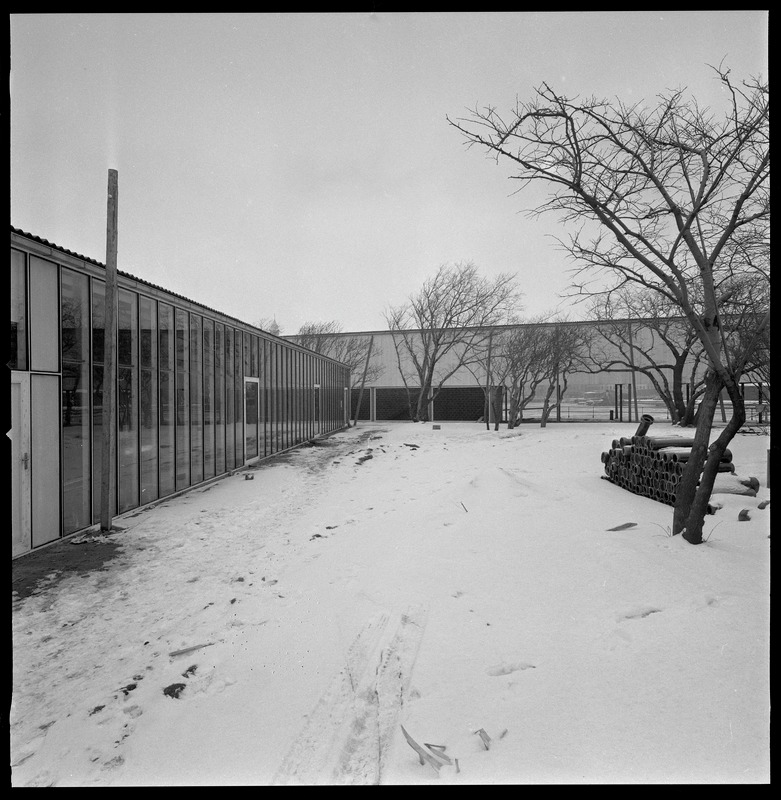 Bilden föreställer en öppen obearbetad yta med enstaka träd. Till vänster och i bakgrunden paviljong.