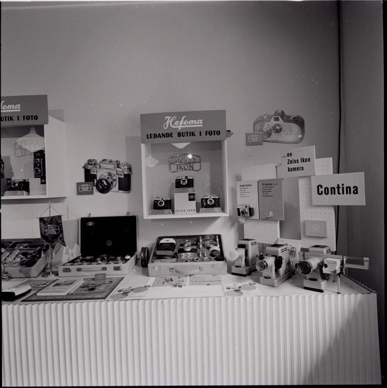Fotografi som avbildar Hefomas stånd på Expo58. På bilden ser vi en disk med kameror och annan elektronik och tillbehör.