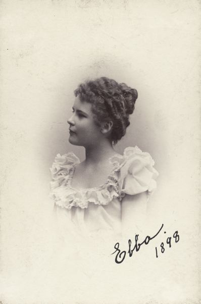 Visitkortsporträtt i halvprofil i svartvitt som avbildar fröken Ebba Follin. Ondulerat hår, uppsatt i knut. Iklädd ljus överdel med volanger i hals och ärmaar.