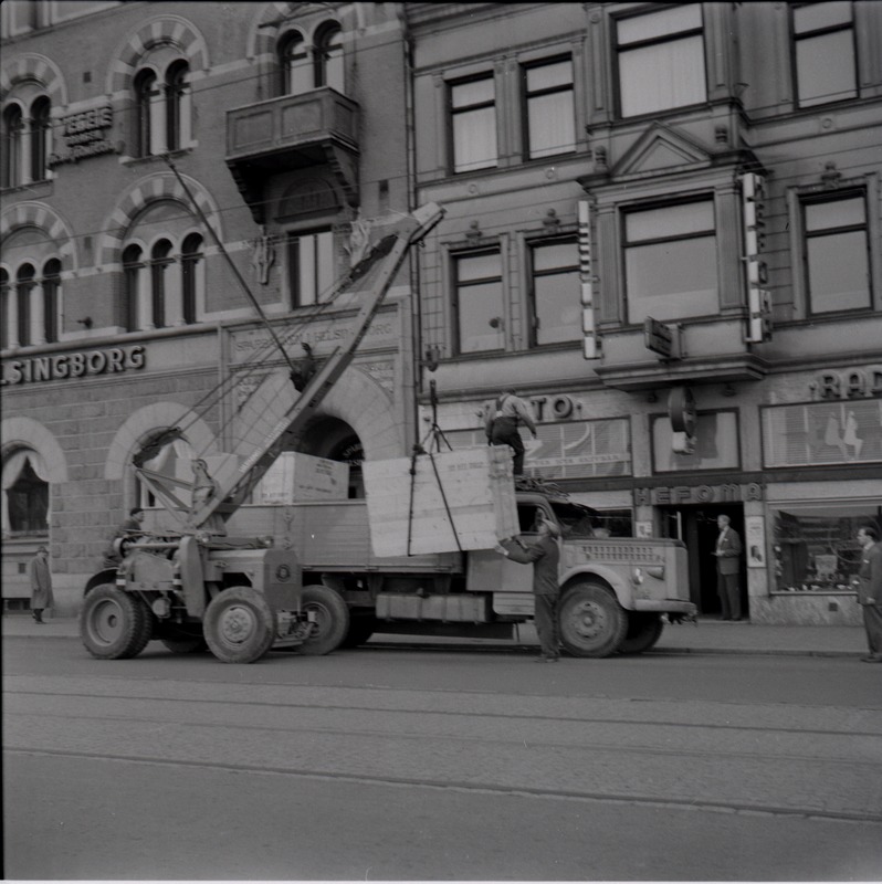 Beskrivning: Fotografi som avbildar en leverans av Pako framkallningsutrusting till Hefomas affär på Järnvägsgatan 3 med hjälp av en lyftkran. Bilden är tagen före ombyggnaden av affären 1957-58.