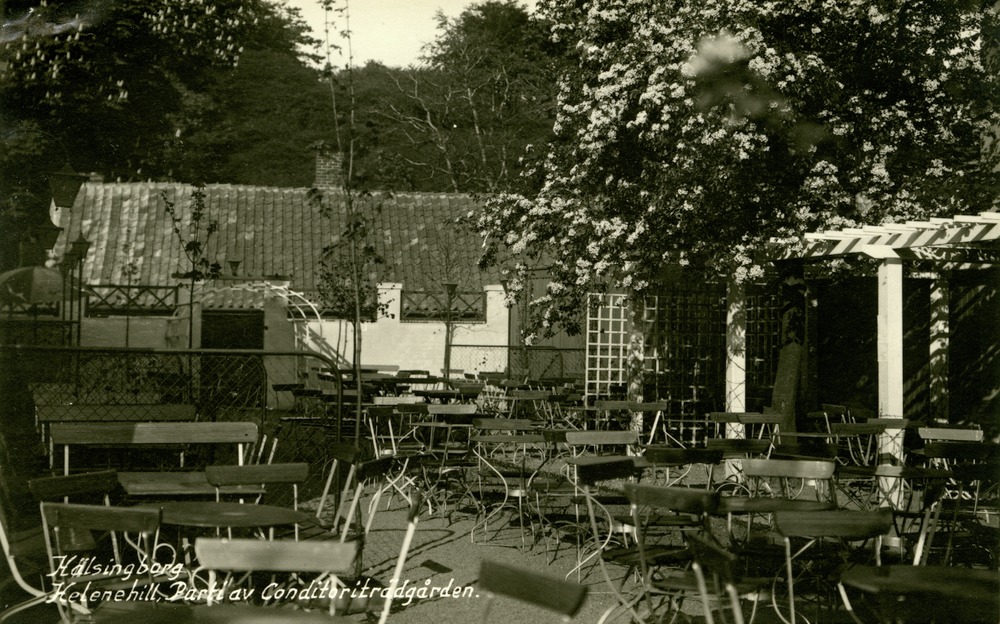 Fotografiet visar en del av konditoriträdgården som hörde till restaurang Helenehill. På bilden syns trädgårdsmöbler och en bit av en pergola.
