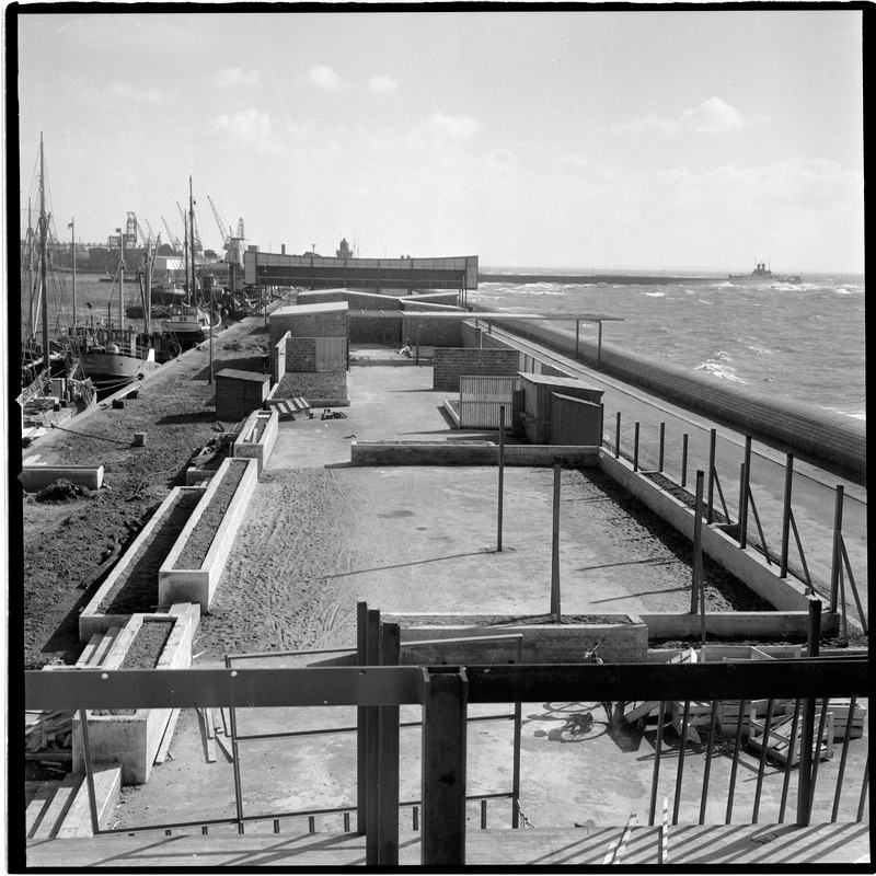 Bilden föreställer en överblick över Parapeten med paviljonger under uppbyggnad. Till vänster hamn och båtar till höger hav