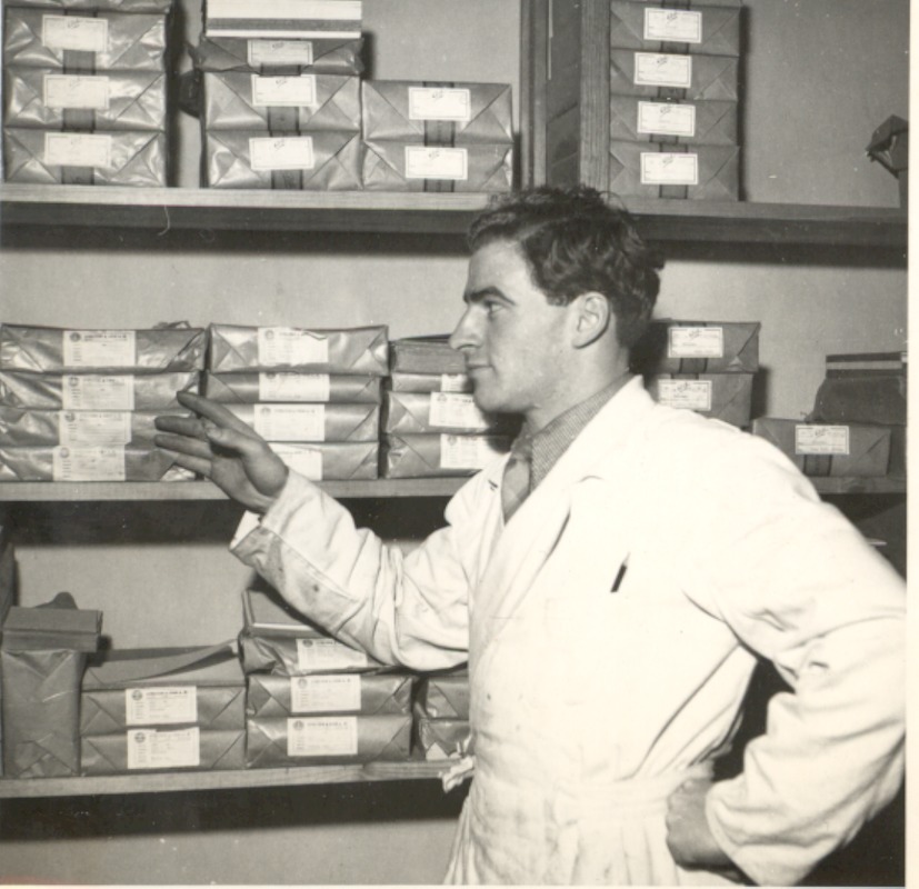 Fotografi som avbildar Kjell Bjerler framför hyllor med lådor. Bilden är troligen tagen i Hefomas labb på Järnvägsgatan 3 eller på en av deras filialer, kanske på Södergatan.