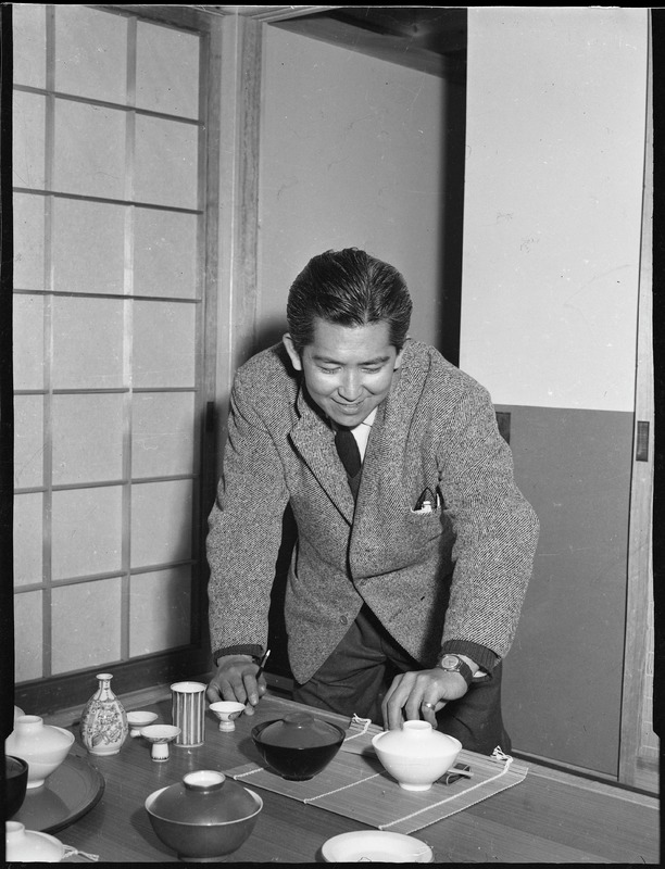 Bilden föreställer en man som står vid ett bord på vilket står skålar med lock, vas och ljusstakar.