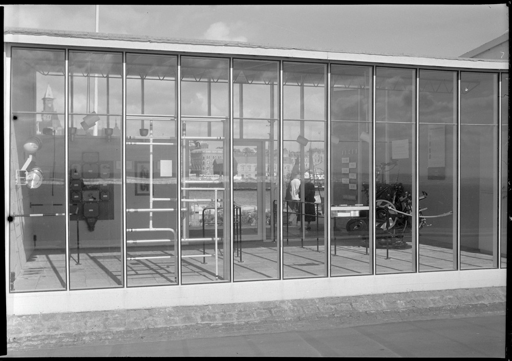 Bilden föreställer en paviljong med glasfasader. Inuti anas en tryckpress samt rörledningar av något slag.